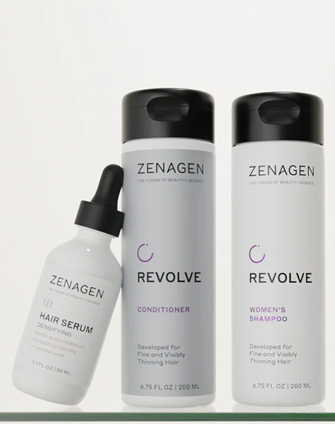 Zenagen offers a number of hair care products that can help mitigate and even reverse hair loss and thicken your clientโs hair when used properly. Chief among these is the Revolve line, which is formulated to support the appearance of fuller, healthier-looking hair. The Revolve Shampoo and Conditioner are both powered by strong botanical extracts and help to make the hair visible thicker and denser.